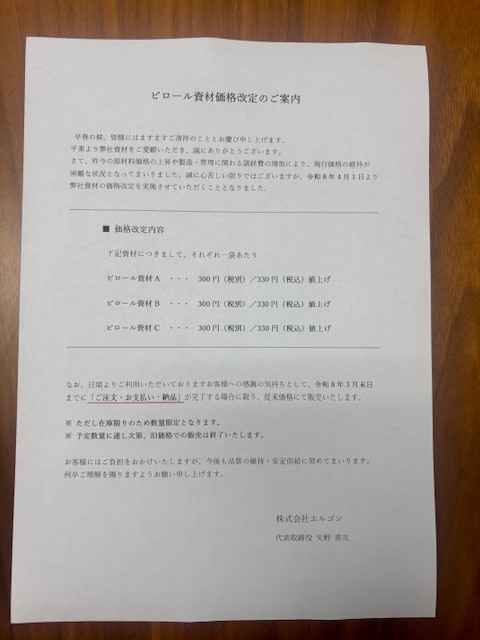 誠に心苦しい限りではございますが、令和8年4月1日より弊社資材の価格改定を実施させて頂く事となりました。